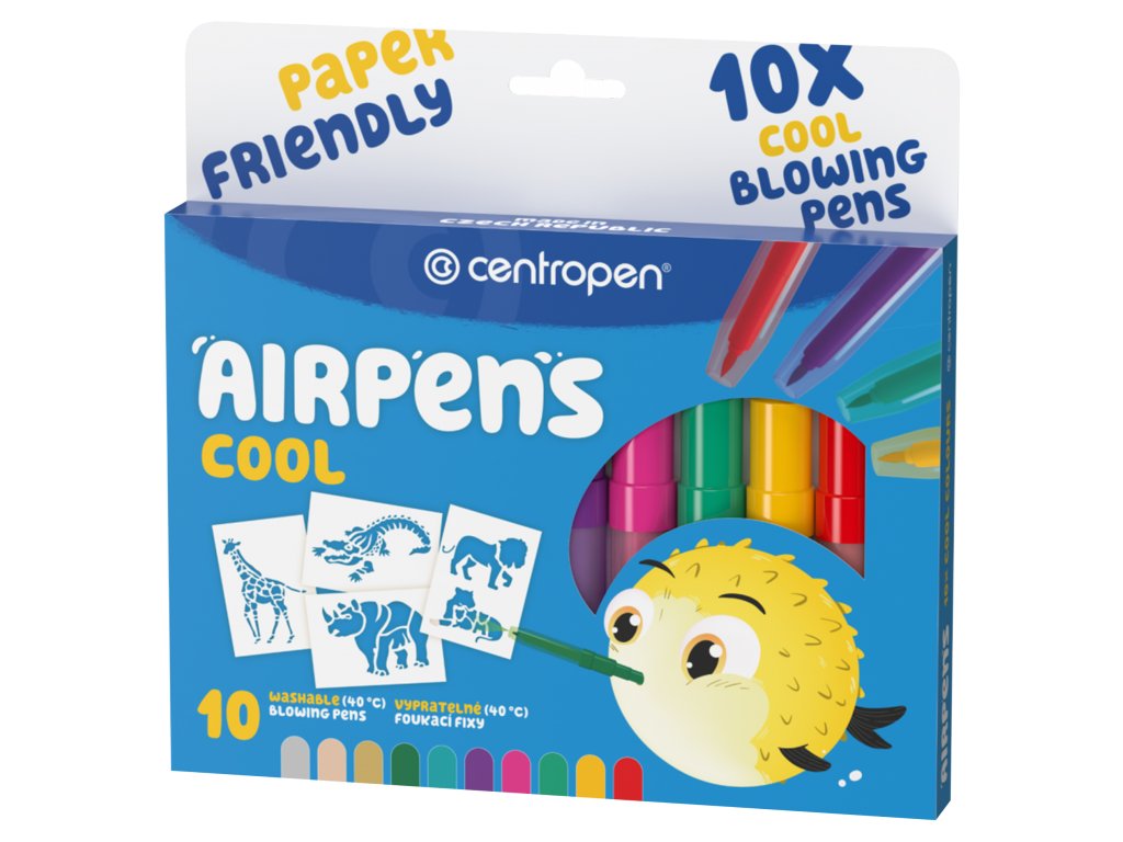 Foukací fixy na papír. Zdravotně nezávadný inkoust. Snadno smyvatelné a vypratelné. 10 barevných odstínů. 4 šablony